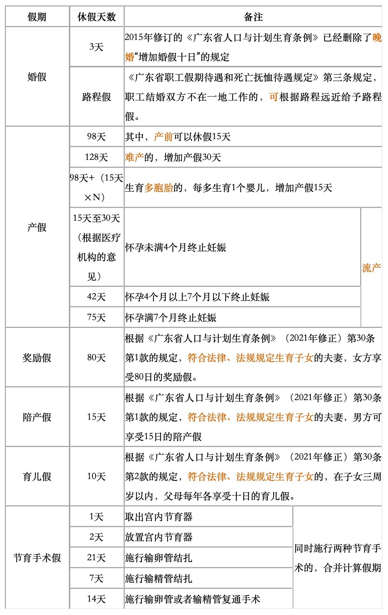 (3)根据《广东省人口与计划生育条例》(2021年修正)第30条的规定,符合法律、法规规定生育子女的夫妻,女方享受80日的奖励假。