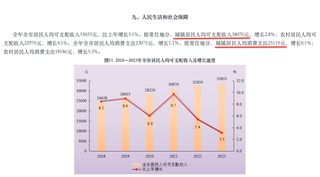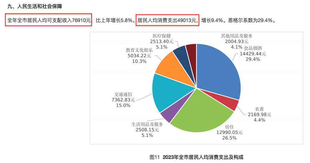 2、2023年深圳市城镇居民人均可支配收入和城镇居民人均生活消费支出,来自深圳市统计局于2024年4月28日发布的《深圳市2023年国民经济和社会发展统计公报》第九章人民生活和社会保障。